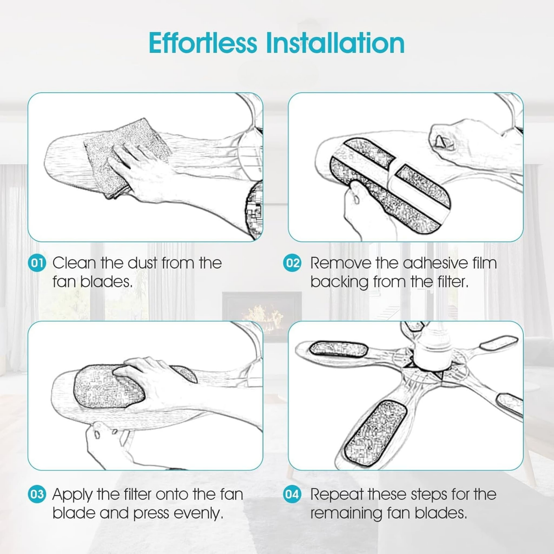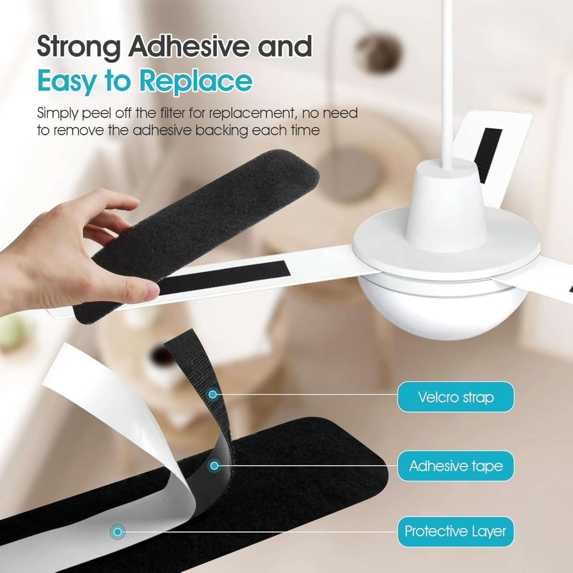 Aeropure filters are designed to stick securely to nearly any ceiling fan blade. No tools, no complicated setup—just peel, stick, and breathe easy. When it’s time to replace them, simply pull off and stick on a new set. You’ll literally feel the difference, and if you weigh them before and after, you’ll see it too.