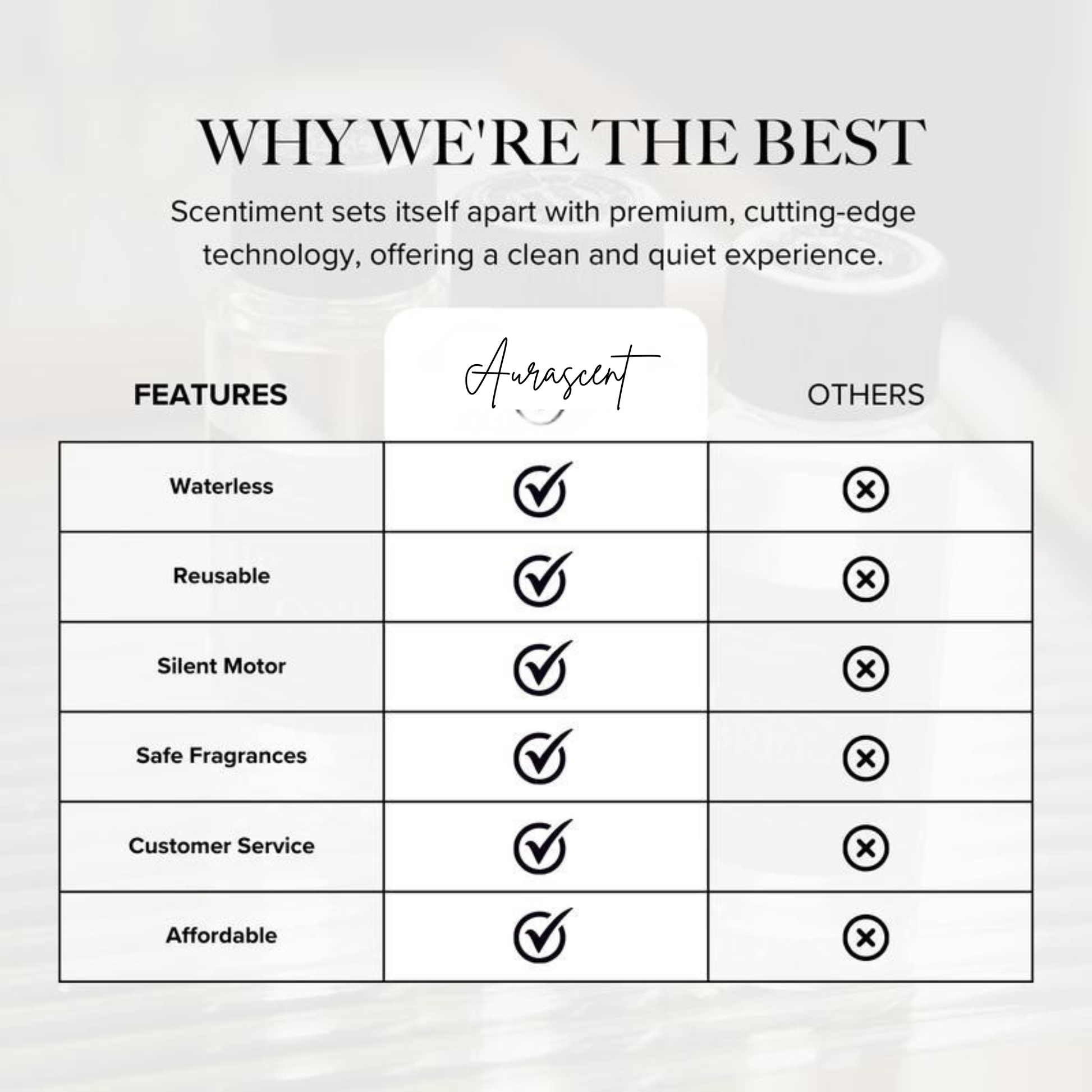 With AURASCENT™, you don’t need to light candles or mess with refills — just switch it on and let the air fill with elegant fragrance. Using cold-air technology, it releases micro-mist particles that scent your space evenly and last all day, without heat, water, or residue.