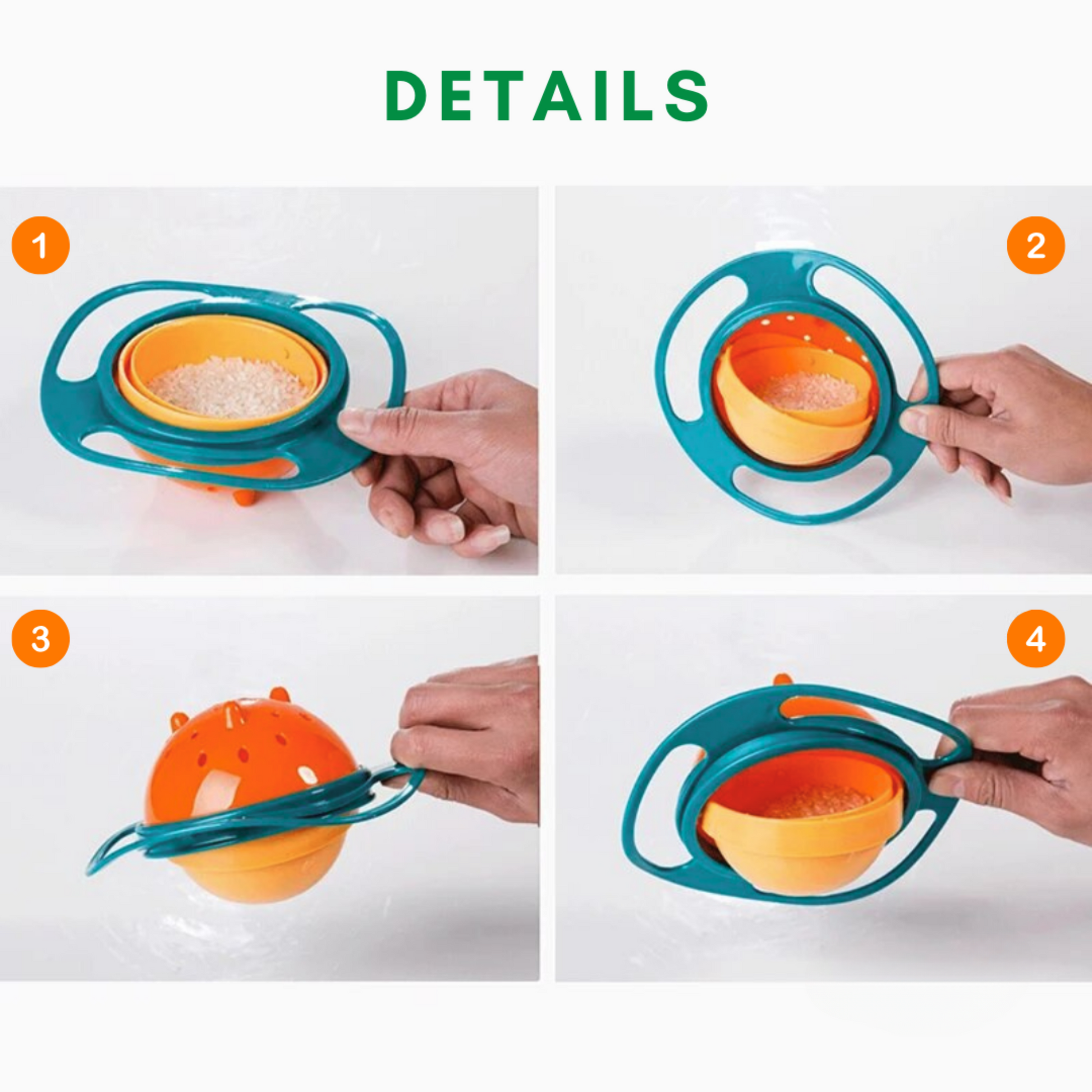 Tired of cleaning up food spills repeatedly? Our TWISTYTOTS Spill-Proof Gyro Bowl is here to rescue you. Designed with innovative gyroscopic technology, this children's bowl ensures that snacks stay in place, preventing messy spills and saving you the hassle of frequent cleanup.