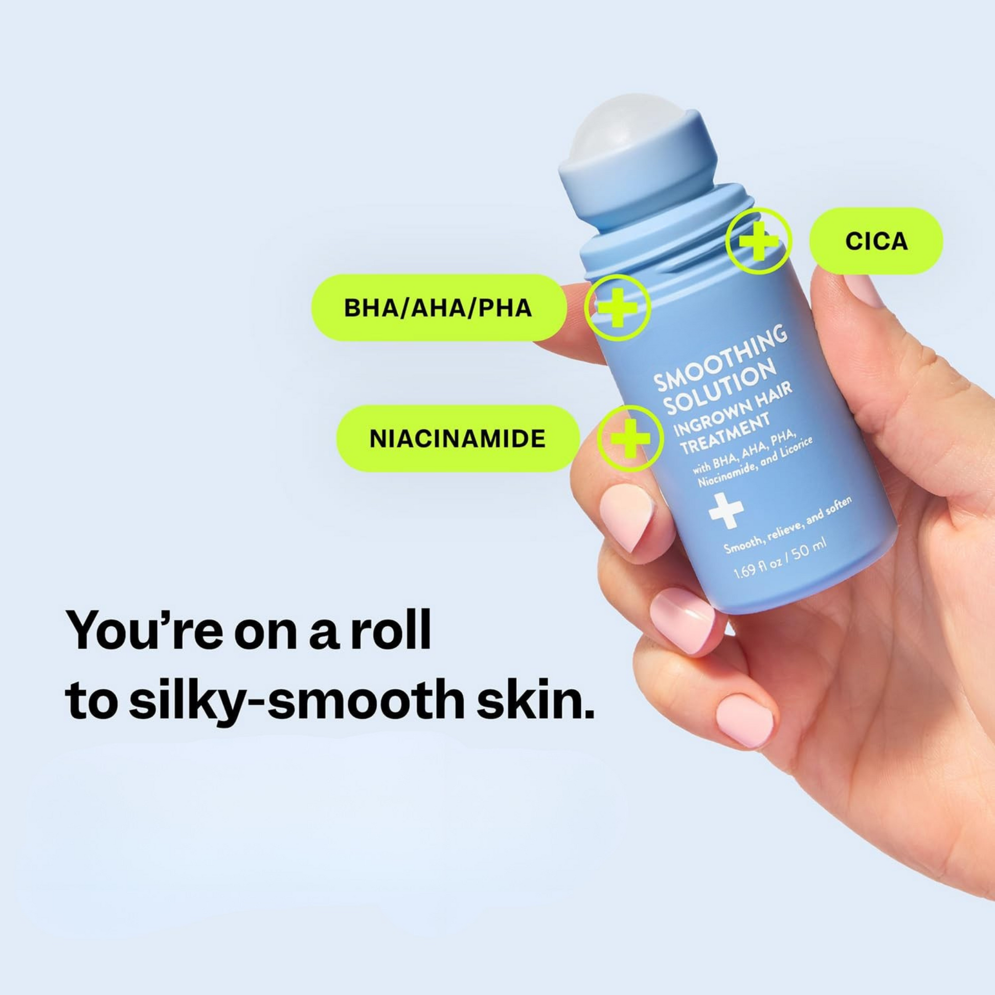 After shaving, waxing, or grooming, roll the treatment onto clean, dry skin where irritation or ingrowns tend to appear (e.g., bikini line, underarms, legs).