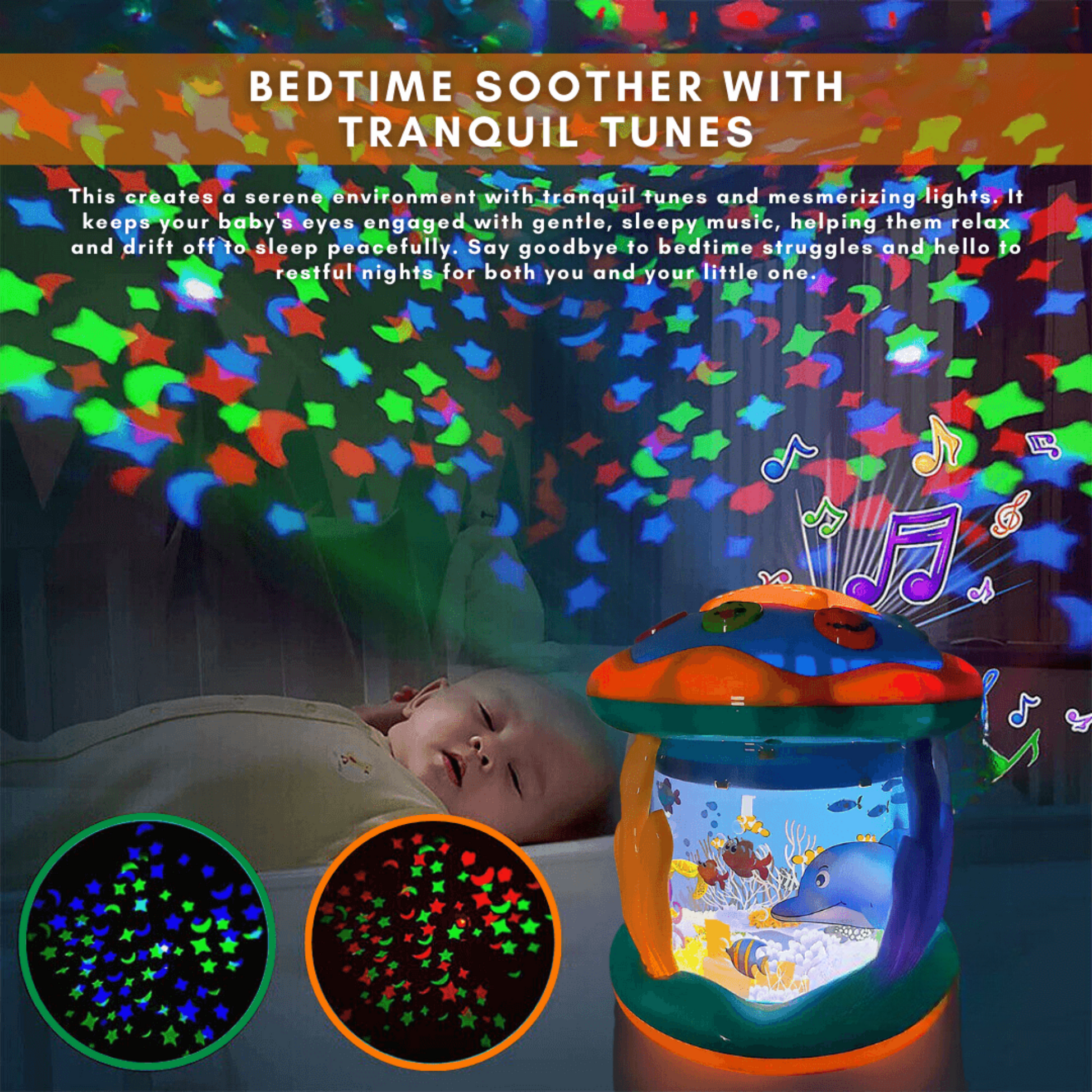Our AQUASPIN Toy features eight mesmerising changing modes, including Red, Blue, Green, and multi-colour pleochroism. The dazzling rotating light effects, coupled with melodious music, transform your baby's room into a serene Ocean World. Soft, soothing projections create a calming environment, ideal for nap time or bedtime.