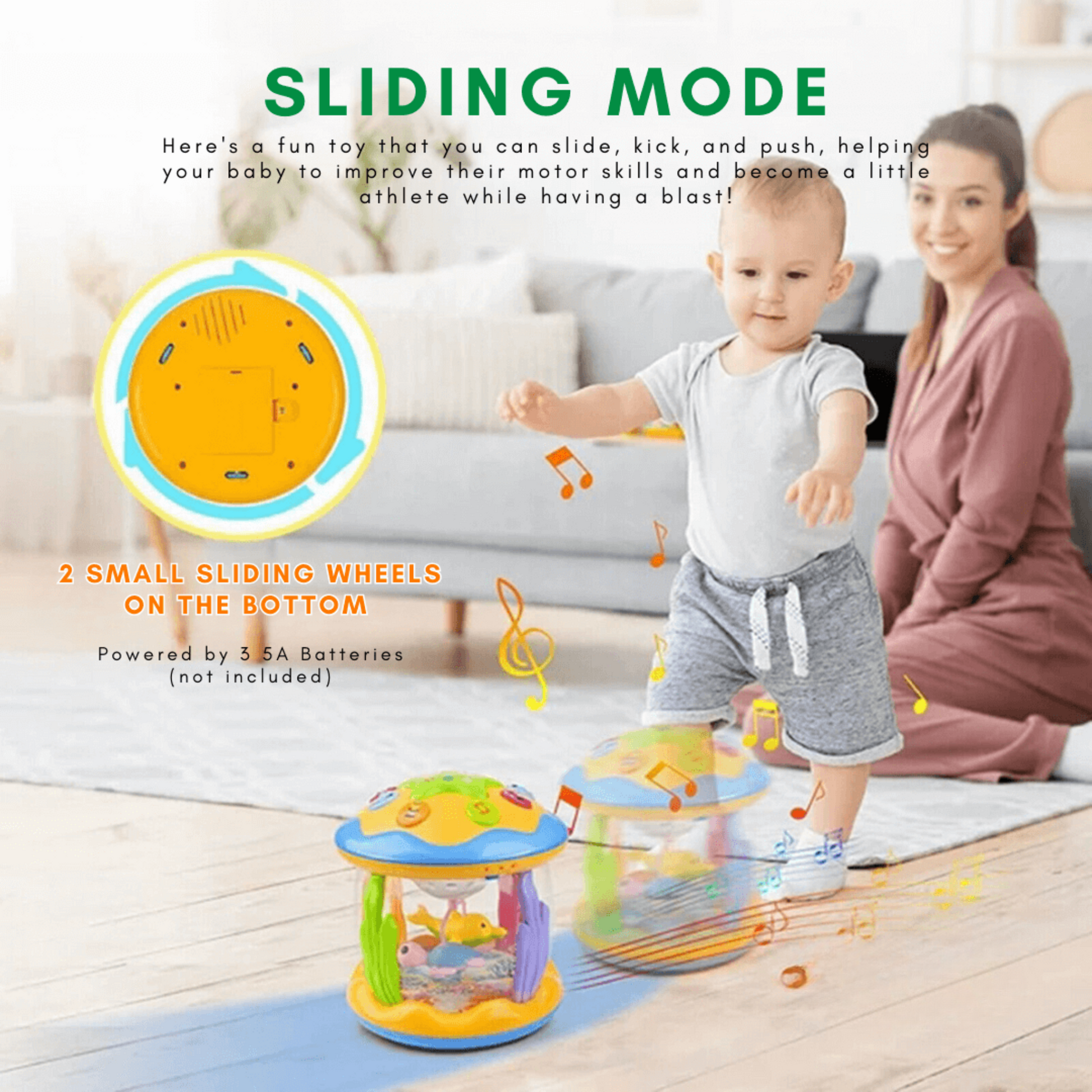 AQUASPIN Ocean Light Projection Toy is more than just a visual and auditory wonder—it also supports your baby's physical development. With three wheels at the bottom, it's perfect for toddlers to crawl and chase. Placing the toy on the ground, your baby can roll it gently, encouraging them to crawl or take those exciting first steps. Your little one gets a head start in their physical development journey.