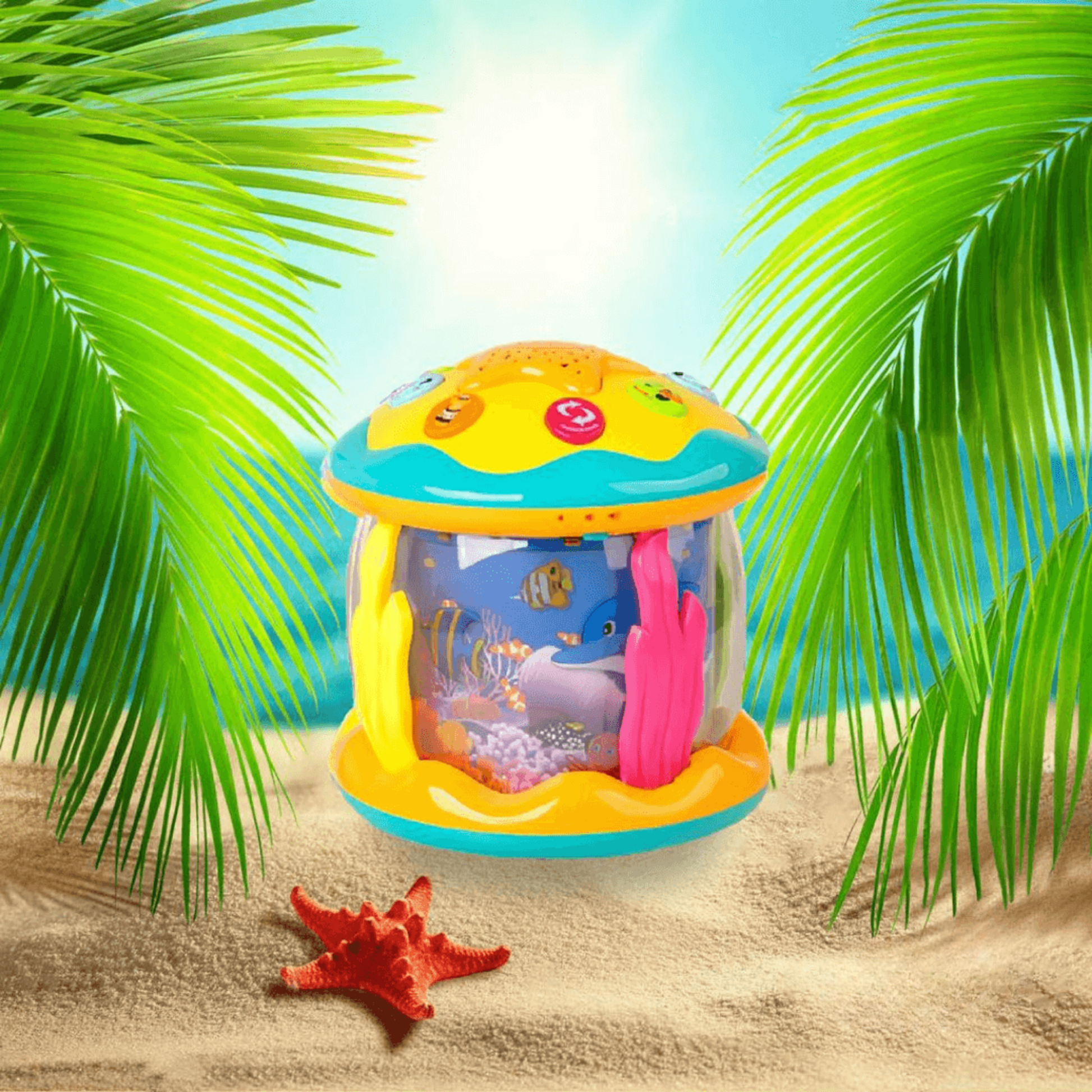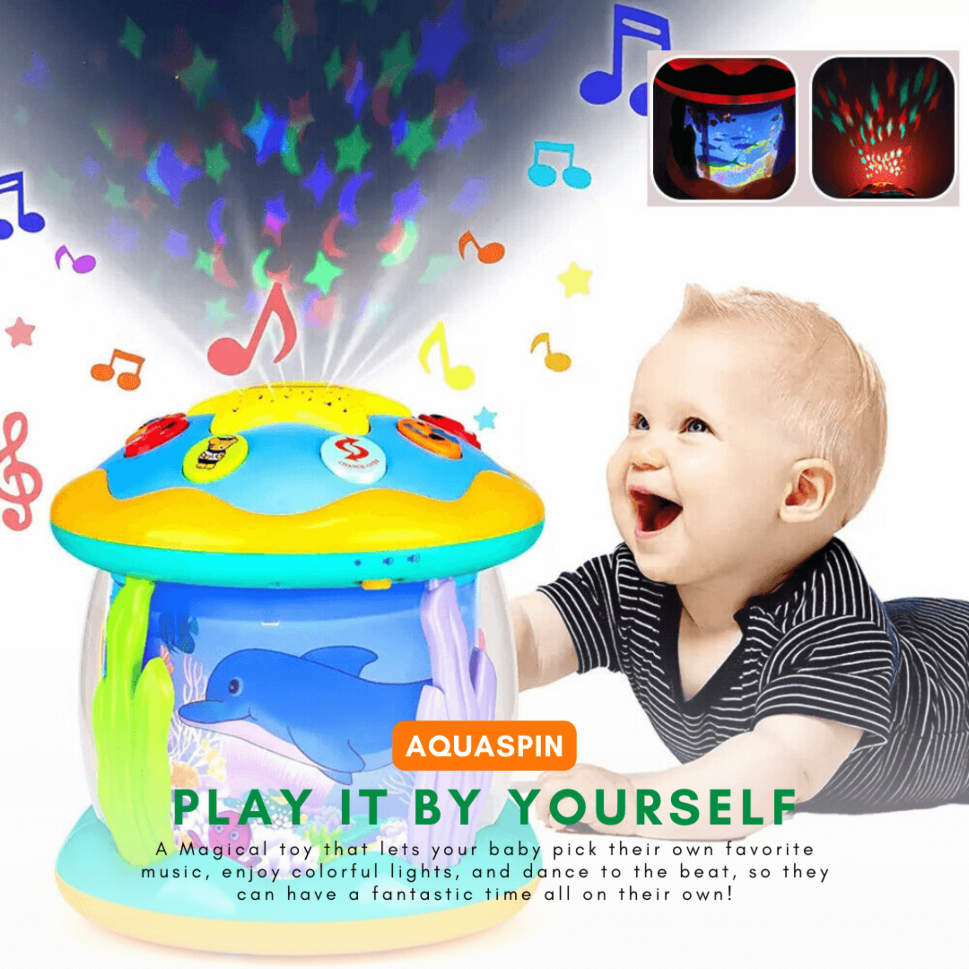 Immerse your baby in a colourful and captivating ocean paradise with our AQUASPIN. The 360° rotating design, featuring adorable turtles and dolphins, provides a mesmerising visual experience for your little one. As the lights dance and the ocean world comes to life, your baby's imagination will soar, ideal for playtime. With six delightful musical melodies, a shipmaster key, and a mode change key, our AQUASPIN Toy offers an enriching auditory experience for babies aged 6 months and up. The adjustable volume control ensures you can create the perfect ambiance for play.