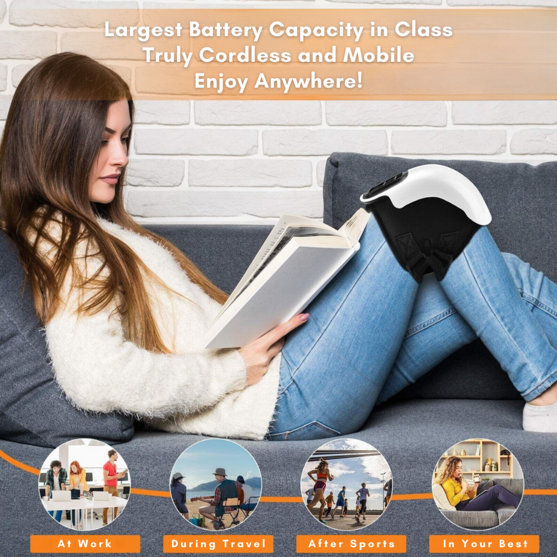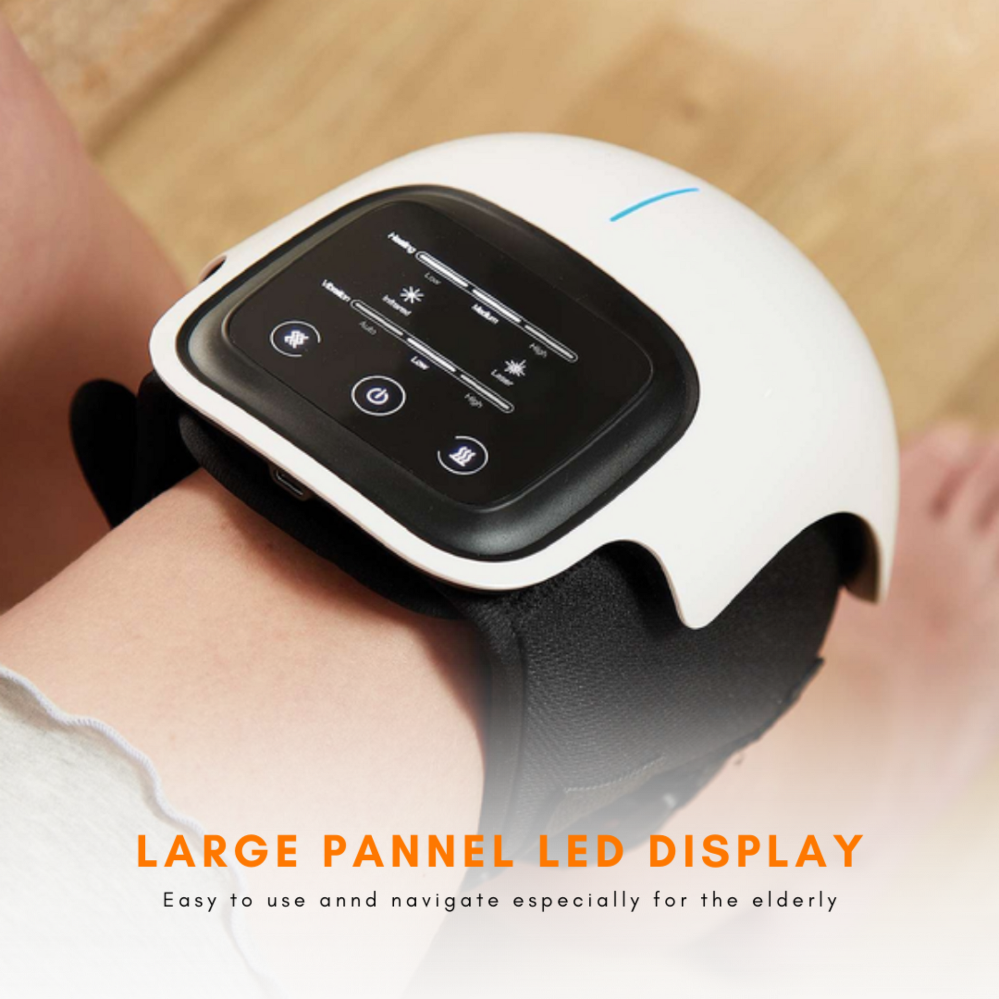 The KneeMaster Pro™ knee massager features an LED touch panel with an intelligent control LED display, making operation a breeze. Its compact design and rechargeable battery make it perfect for on-the-go use, whether you're traveling or simply moving around your home.