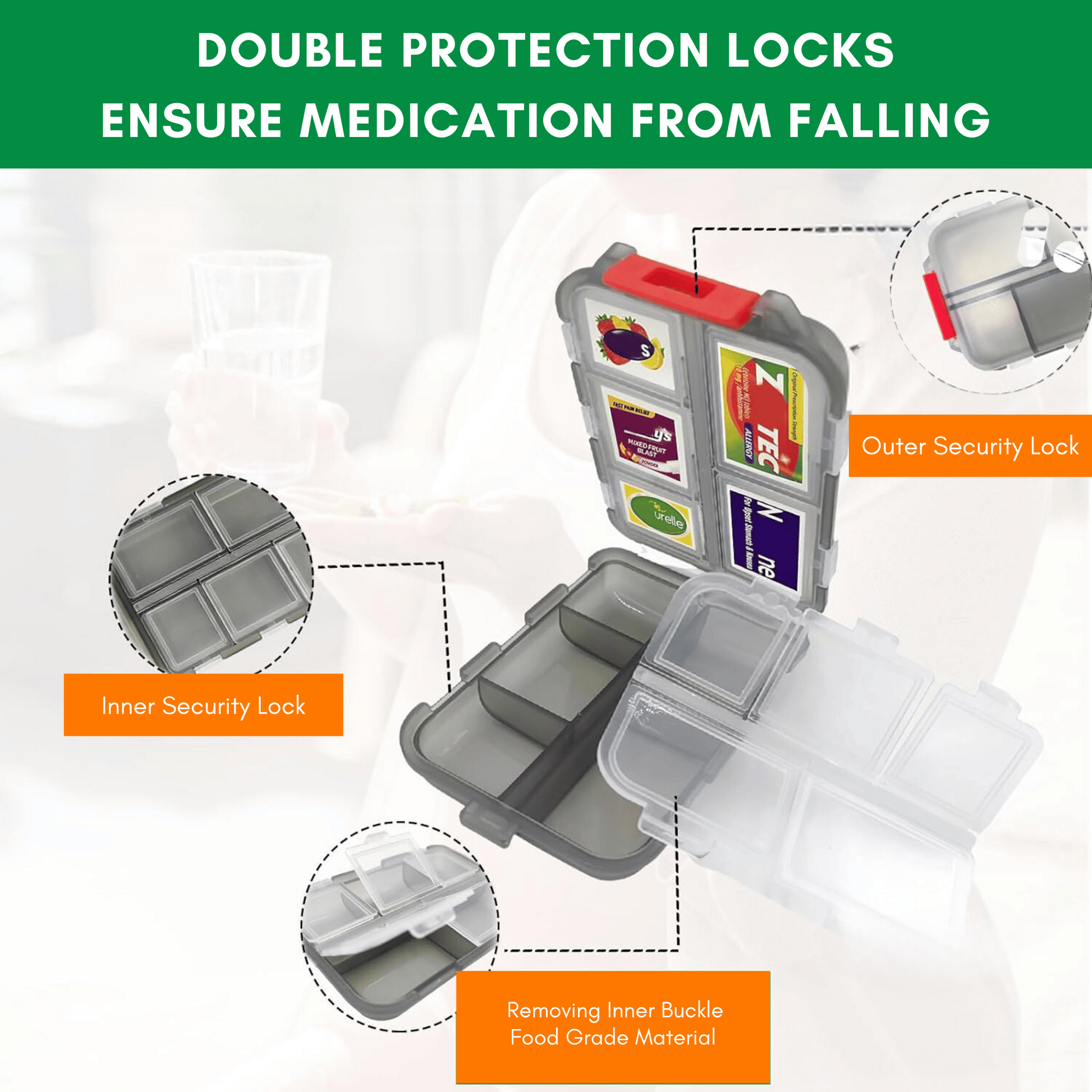 The MEDPACK Med Wallet features a secure, double snap-lock closure on each compartment, preventing pills from spilling or mixing. Its slim and compact design easily fits in your pocket or bag, providing on-the-go convenience. Whether you're at home, work, or traveling, you can trust that your medications are safely stored and easily accessible when needed.