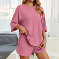 Say goodbye to stiff fabrics and awkward fits. The MODESSÉ Comfy Short Sleeve Tee & Sporty Shorts Set is crafted with lightweight, stretchy fabric that glides over every curve. The roomy tee gives that oversized vibe without swallowing your shape, while the elastic waistband keeps the shorts snug without digging in — even if you’re between sizes.