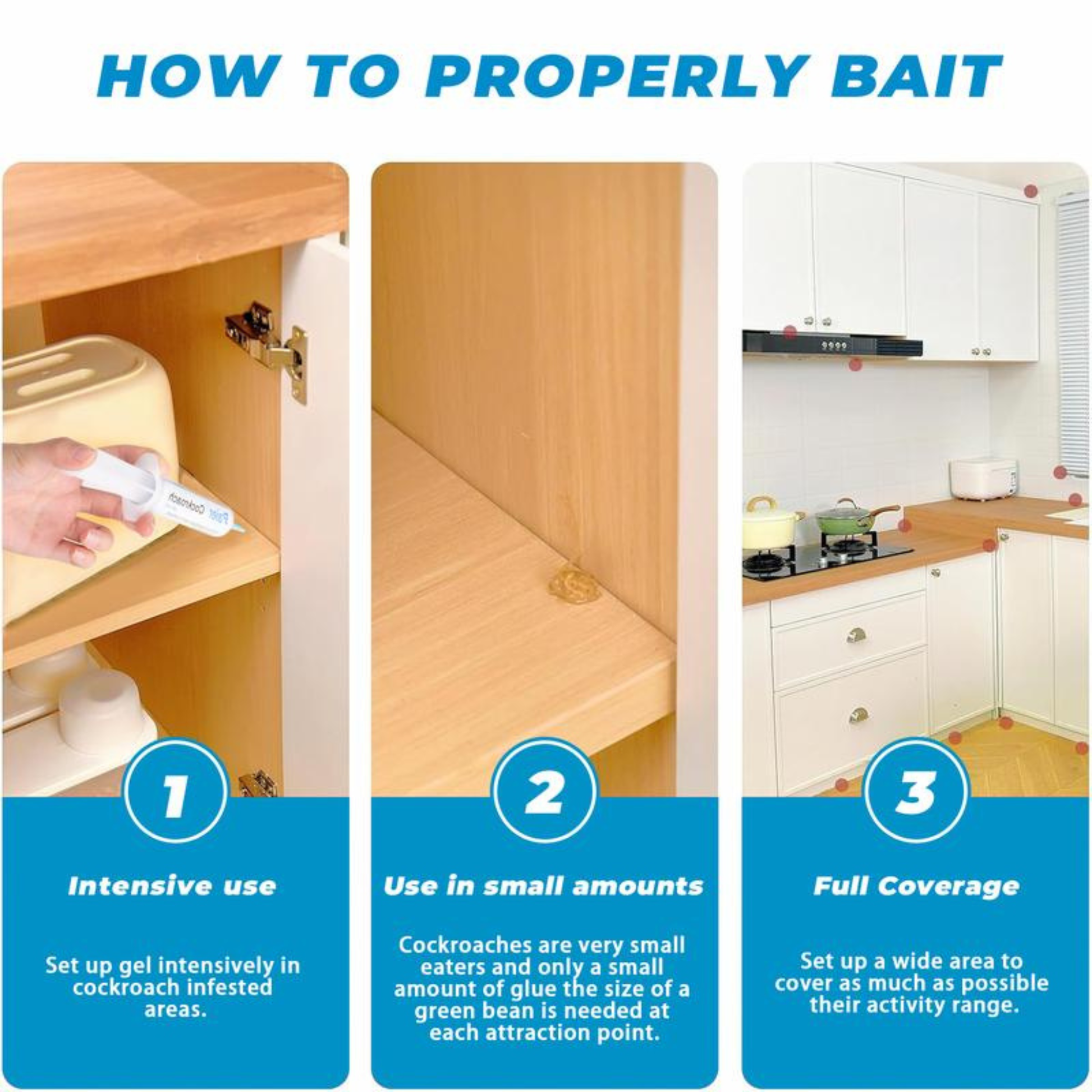 Step 1 – Place small pea-sized dots of gel in areas where cockroaches hide (under sinks, behind appliances, along cabinet edges).
