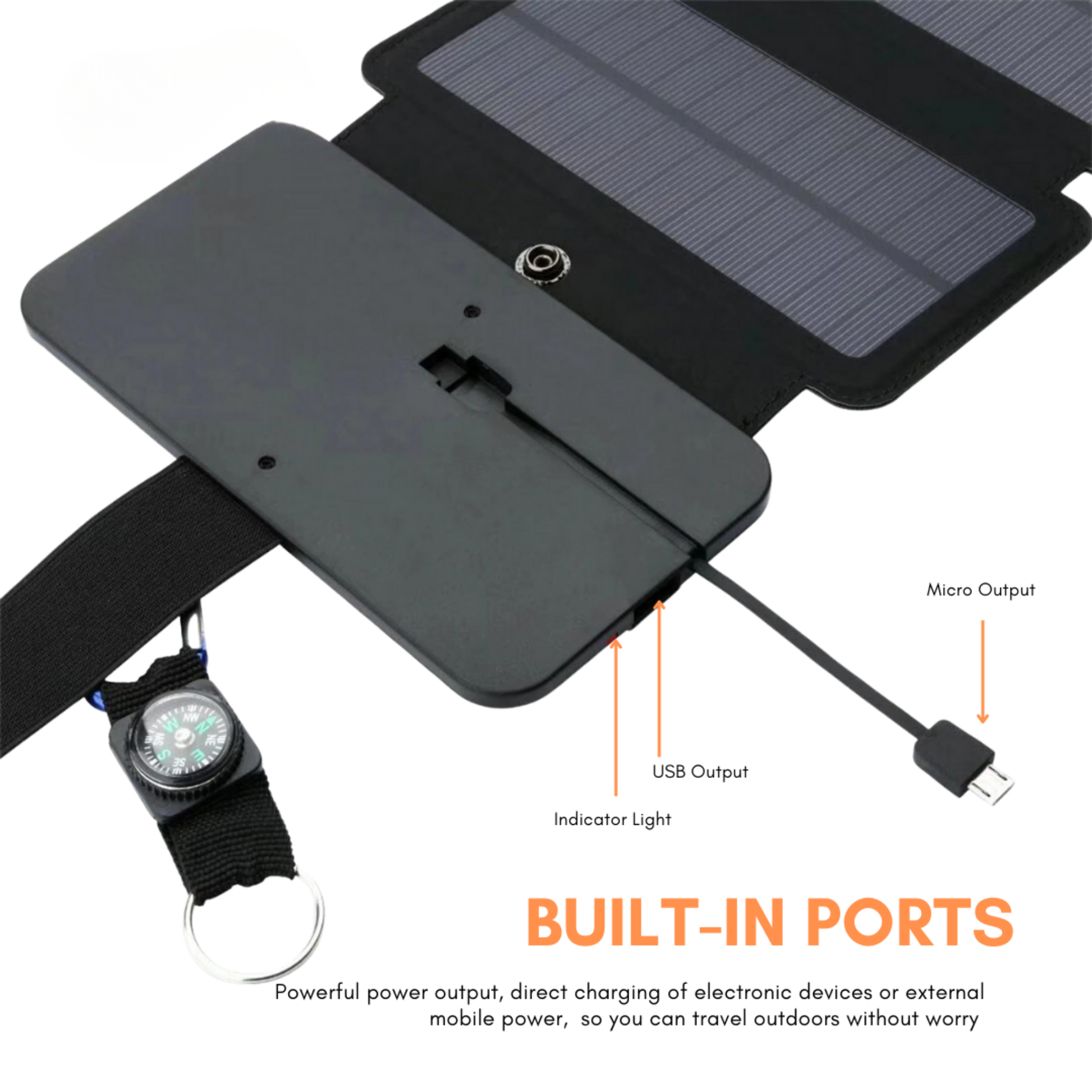 The built-in compass hanging buckle makes it easy to hang or attach to your backpack, tent, or any other gear while on the move. POWERFOLD Outdoor Solar Panel Charger can be directly connected to a mobile power supply, with a soft elastic buckle that can be bundled with various mobile power supplies to better protect your electronic devices.
