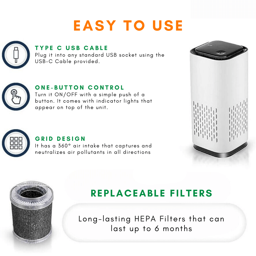 ✔️ Convenient USB Charging: Effortless charging ensures your purifier is always ready when you need it.