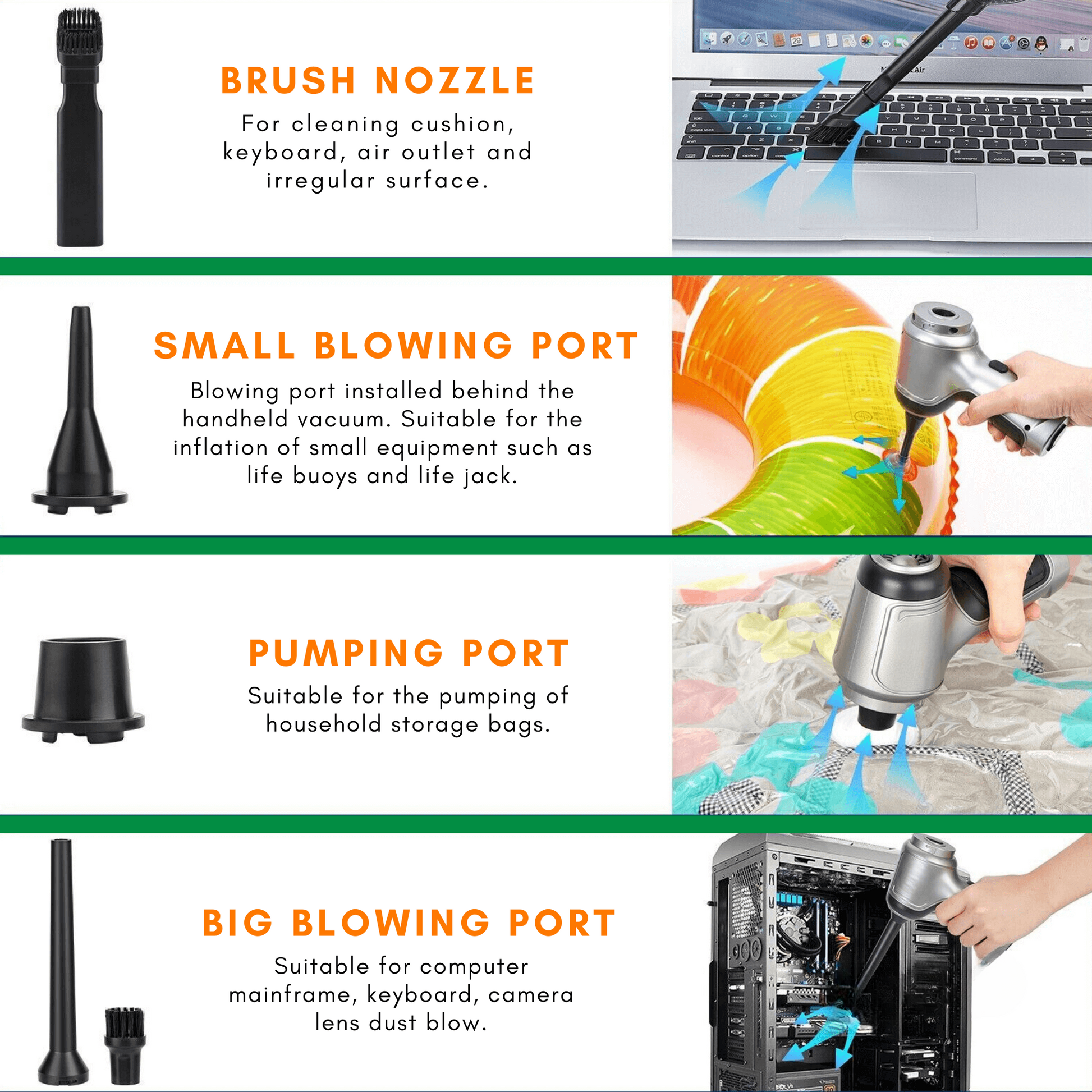 The VOLTEX Portable Electric Car Vacuum Cleaner is a powerhouse with its 3 different nozzles catering to various cleaning needs. Effortlessly transition from household cleaning to inflating life rings or jackets, and even become a vacuum pump for efficient storage solutions. Say goodbye to multiple devices cluttering your space.