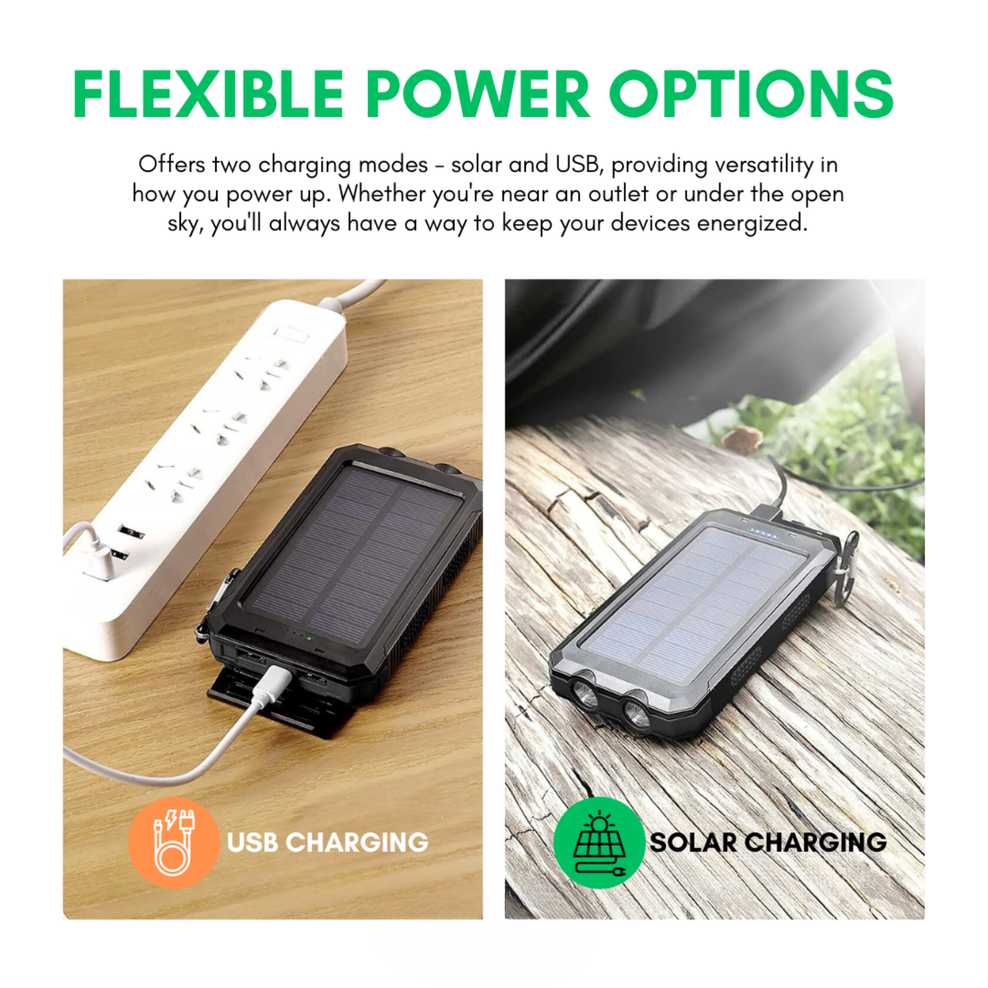 Integrated compass and buckle for easy portability. Dual USB interface for multi-device charging. Constructed with PC flame retardant materials for enhanced safety and a super bright military-grade LED light and SOS emergency signal.