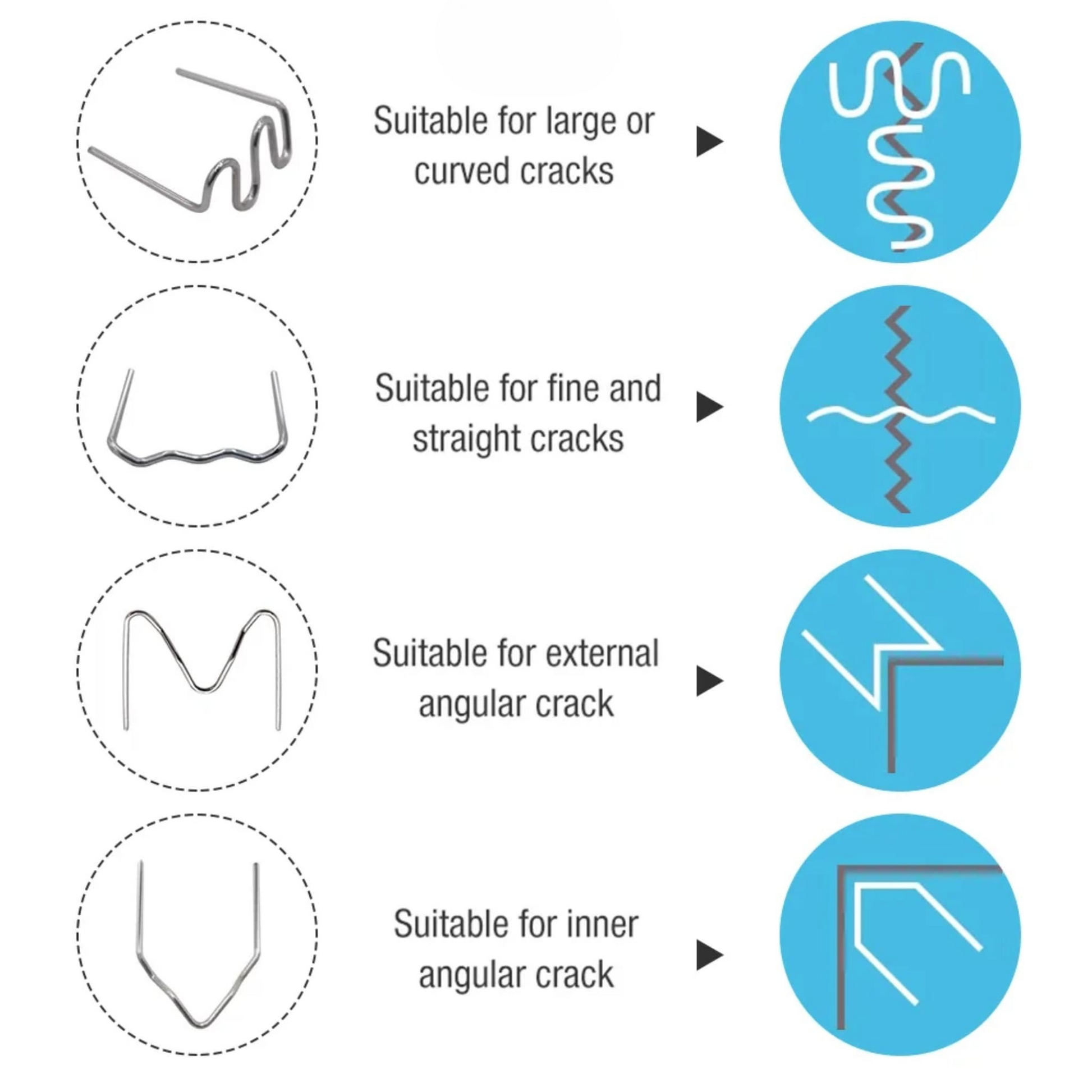 Select the correct staple for the job (Wave, Flat, M-Type, or V-Type) based on the crack or break you're repairing.