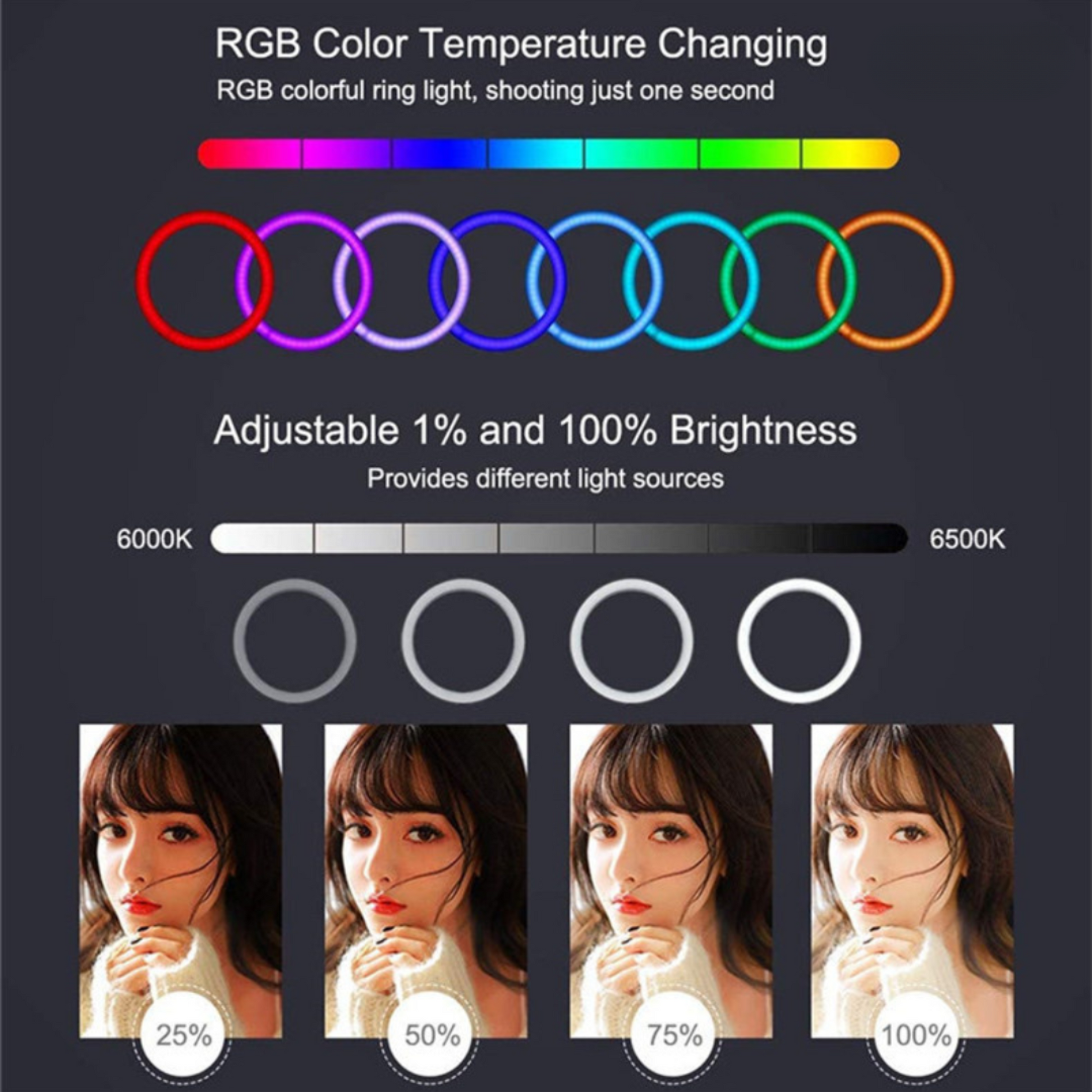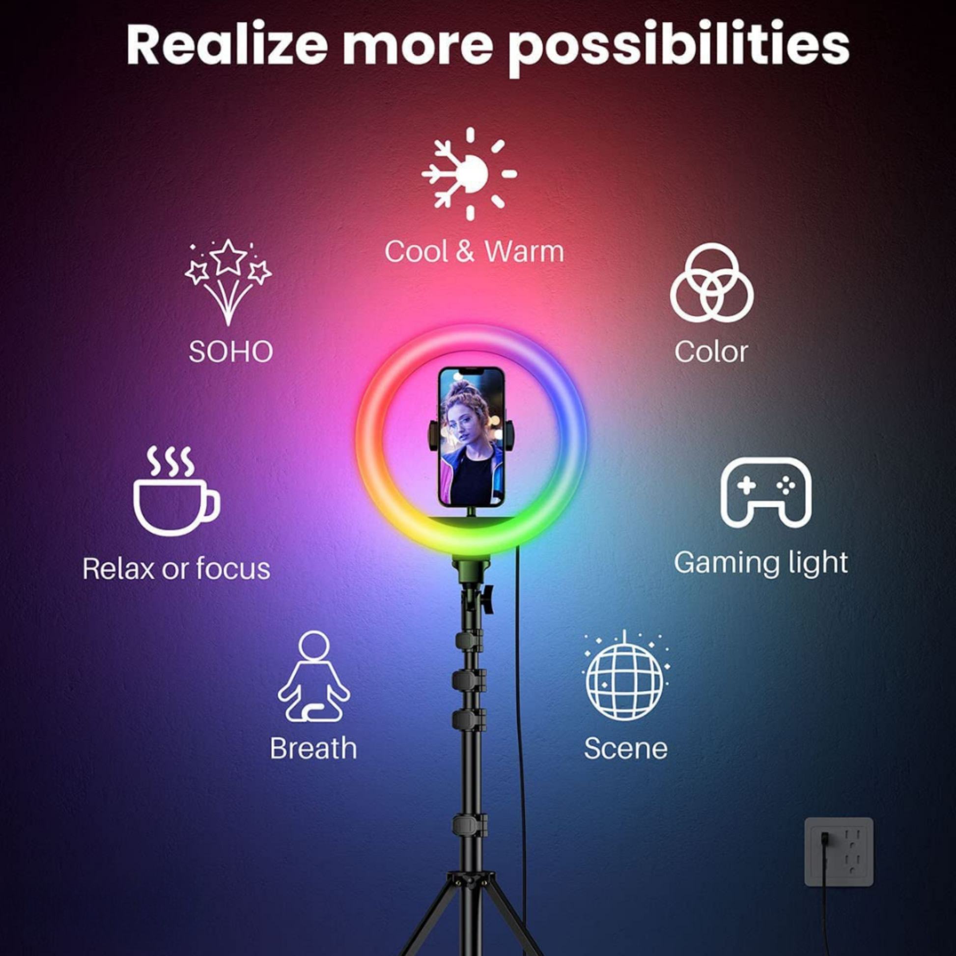 The ring light has 3 conventional lighting options and 35 dynamic modes, such as color light jump, color light gradient, rainbow, meteor shower, and breathing light mode. This variety of lighting modes ensures that you will always have the perfect lighting to enhance your look.