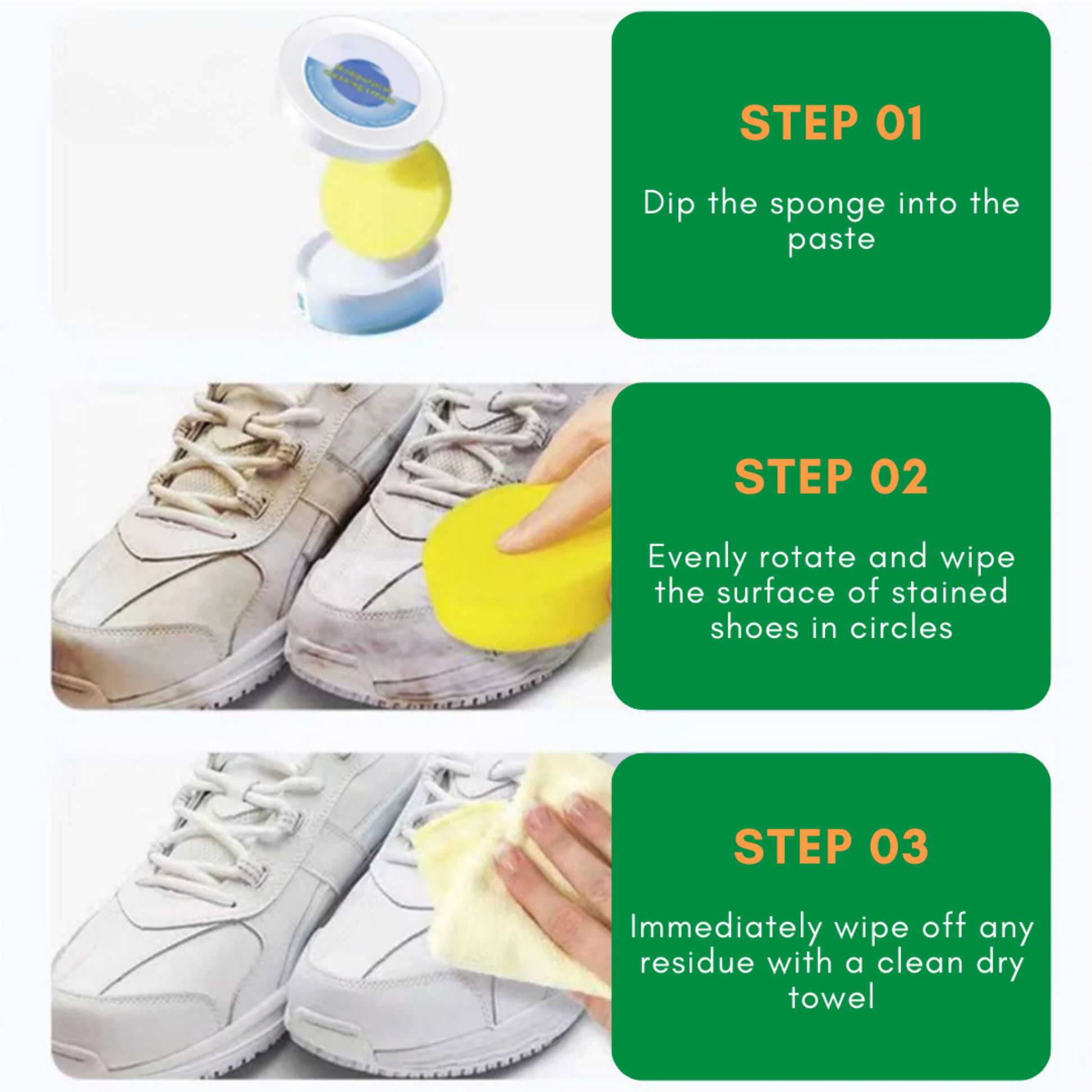 Say goodbye to stubborn stains and welcome back the original allure of your shoes. STAINVANISH, our quick-clean shoe stain removal cream, is a potent solution that works wonders on various shoe surfaces. From dirt to grime, this powerful formula restores your shoes to their pristine condition, making them look as fresh as the day you first wore them.