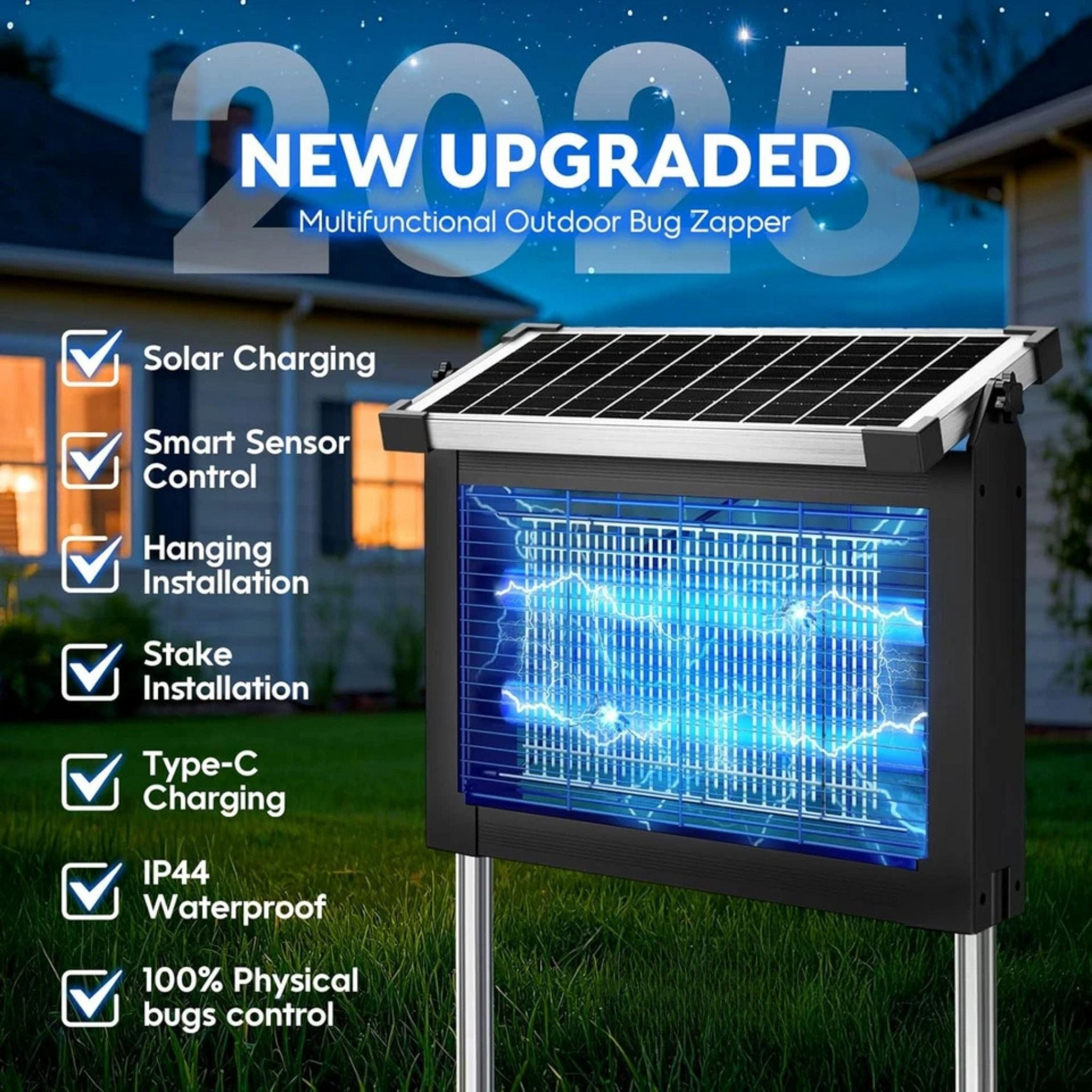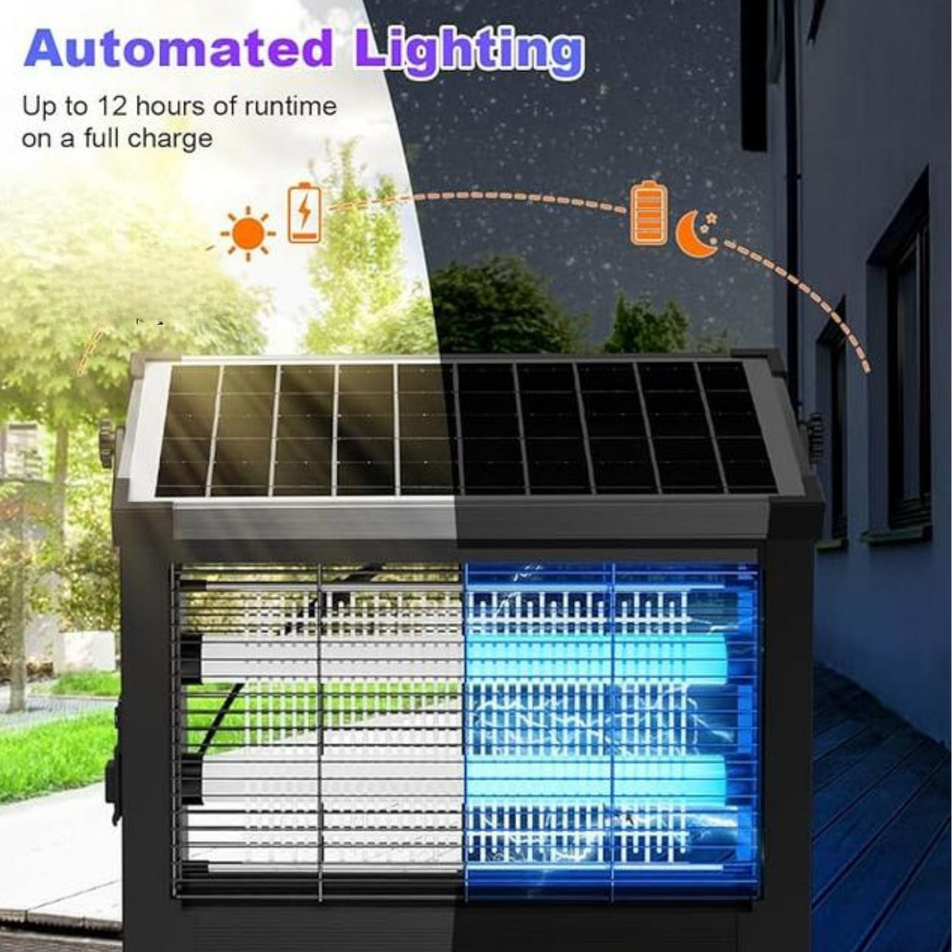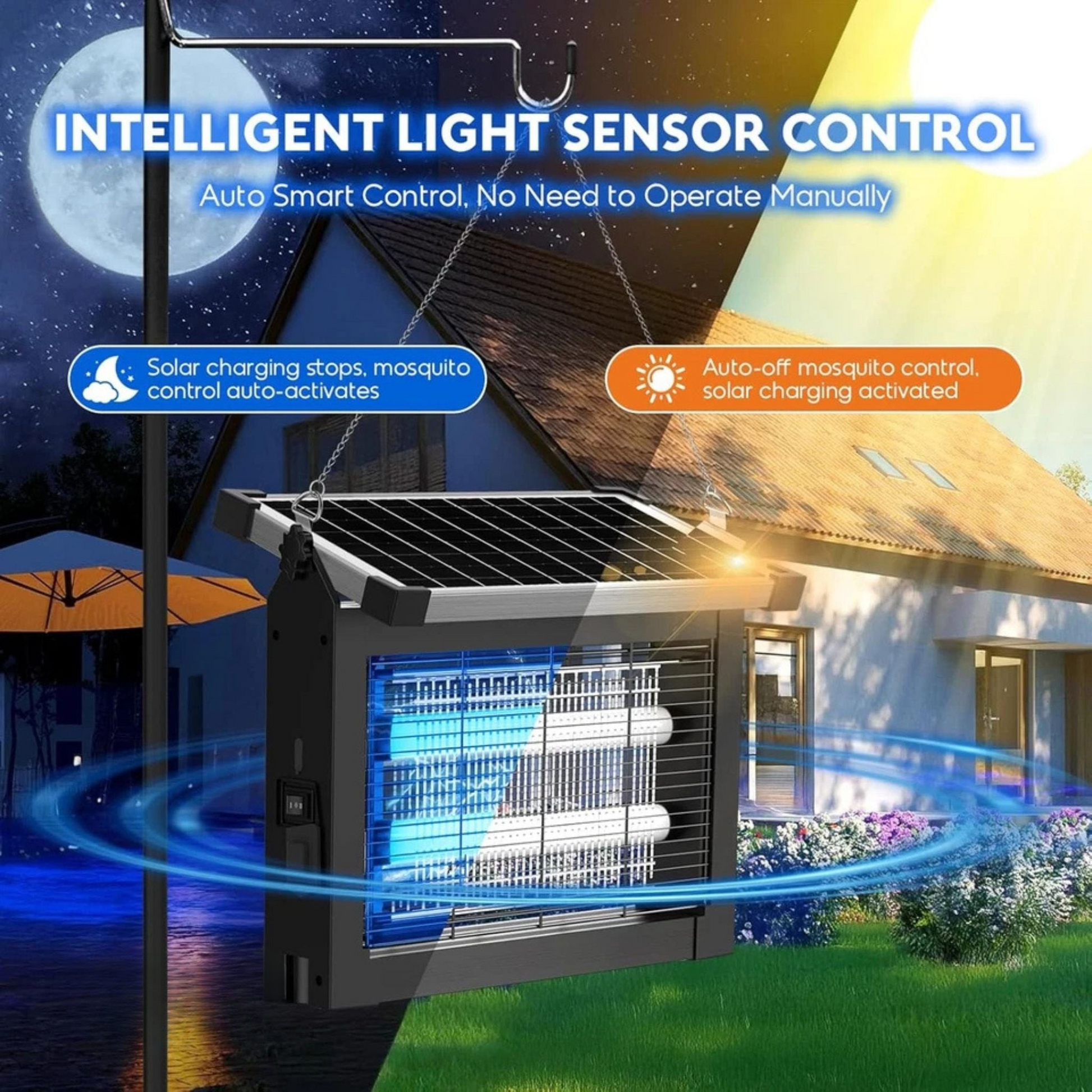 ✔️ Automatic Day/Night Function – Charges by day and turns on automatically at dusk, giving you hassle-free, round-the-clock insect protection.